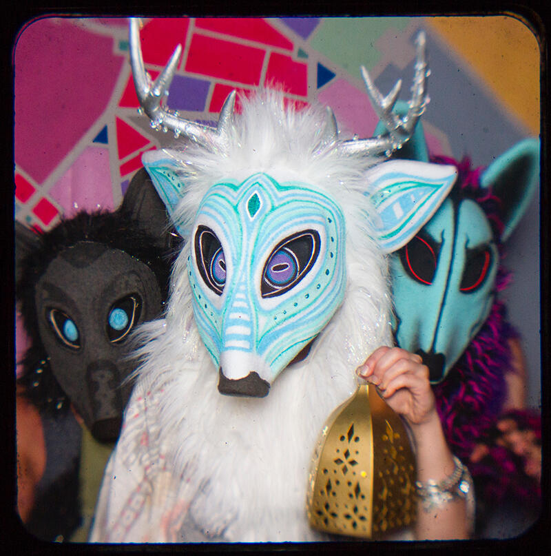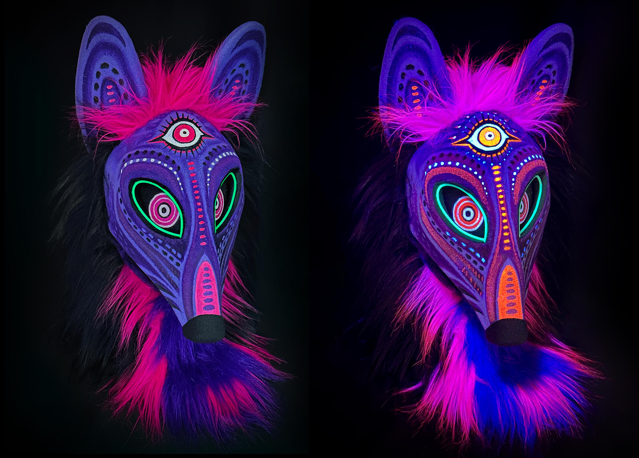 Handpainted, one of a kind original dance mask available for purchase.This mask features UV reactive accents as well as a matching tail (not pictured). Vision thru the eyes. Super lightweight, this mask can be worn over your face or on top of your head like a headdress. You'll get a LOT of attention wearing this piece to your next con or rave. Check out photos of my other masks being worn HERE.I do not accept commissions or customs for these masks. This is a rare opportunity to own one of my original creations.